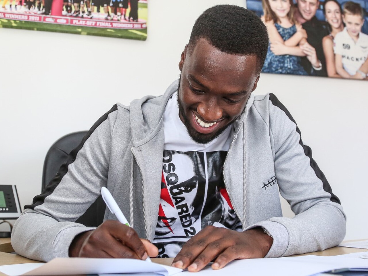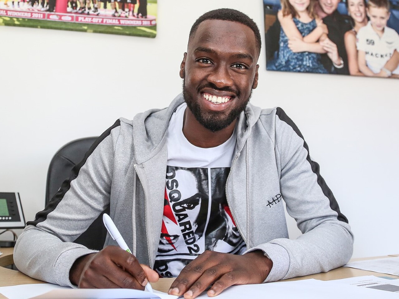 New Peterborough United striker Mo Eisa pictured signing for Posh after completing his club record transfer deal from Bristol City.